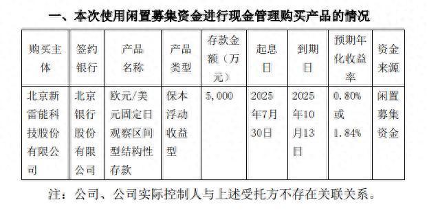 7月30日,新雷能(300593)公告称,近日,公司使用5,000万元闲置募集资金购买了银行理财产品,产品名称为欧元/美元固定日观察区间型结构性存款,到期日为2025年10月13日,签约银行为北京银行股份有限公司。